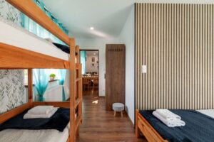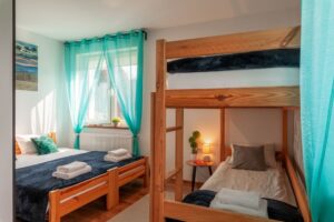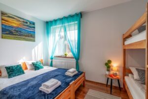 W drugim pomieszczeniu znajduje się sypialnia z jednym piętrowym łóżkiem oraz łożem małżeńskim ( możliwość rozdzielenia na dwa pojedyncze). Jest także pojemna szafa i mały stolik.