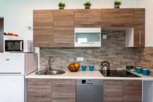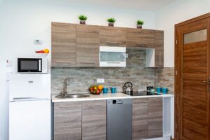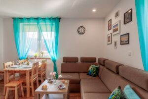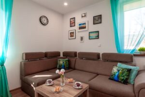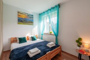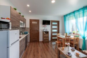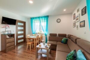 Apartament 6 osobowy złożony z dwóch pomieszczeń oraz łazienki z kabiną prysznicową. W pierwszym znajduje się przestronny salon z rozkładanym narożnikiem, który stanowi dodatkowe miejsce do spania, stół z krzesłami, telewizor oraz aneks kuchenny. Aneks jest wyposażony w dużą płytę indukcyjną, lodówkę, mikrofalówkę, zmywarkę oraz zlewozmywak. Do dyspozycji są również garnki, patelnia, naczynia, sztućce oraz czajnik.