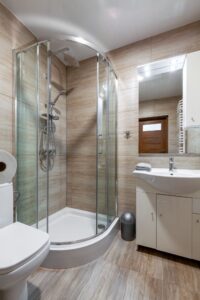 Łazienka z dużą kabiną prysznicową, wyposażona w suszarkę do włosów oraz ręczniki w cenie apartamentu.