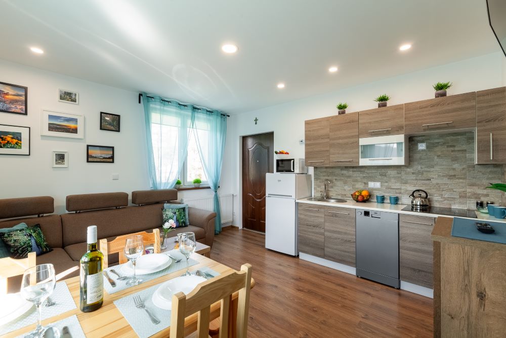 Apartament 6 osobowy złożony z dwóch pomieszczeń oraz łazienki z kabiną prysznicową. W pierwszym znajduje się przestronny salon z rozkładanym narożnikiem, który stanowi dodatkowe miejsce do spania, stół z krzesłami, telewizor oraz aneks kuchenny. Aneks jest wyposażony w dużą płytę indukcyjną, lodówkę, mikrofalówkę, zmywarkę oraz zlewozmywak. Do dyspozycji są również garnki, patelnia, naczynia, sztućce oraz czajnik.