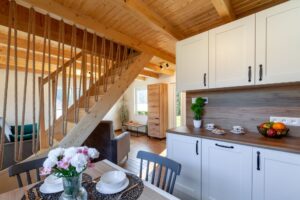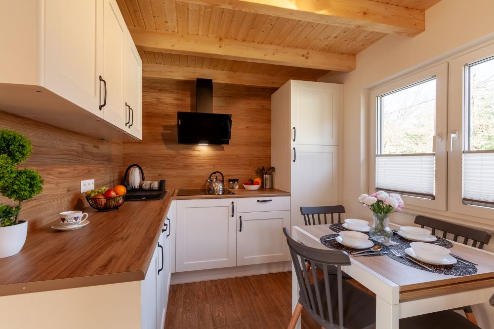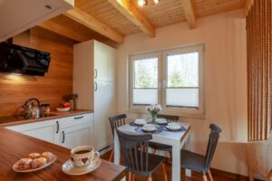 Domek wyposażony w telewizję naziemną i Wi-Fi. Przestronna kuchnia posiada dużą lodówkę, zmywarkę, kuchenkę mikrofalową i płytę indukcyjną. Stół w kuchni jest rozkładany – idealny dla 6 osobowej rodziny. Goście nie muszą również zabierać ze sobą ręczników oraz suszarki do włosów.