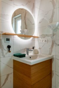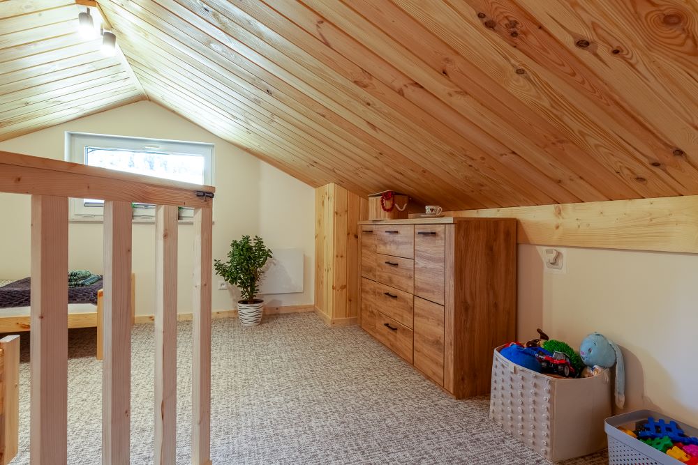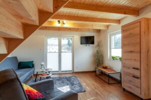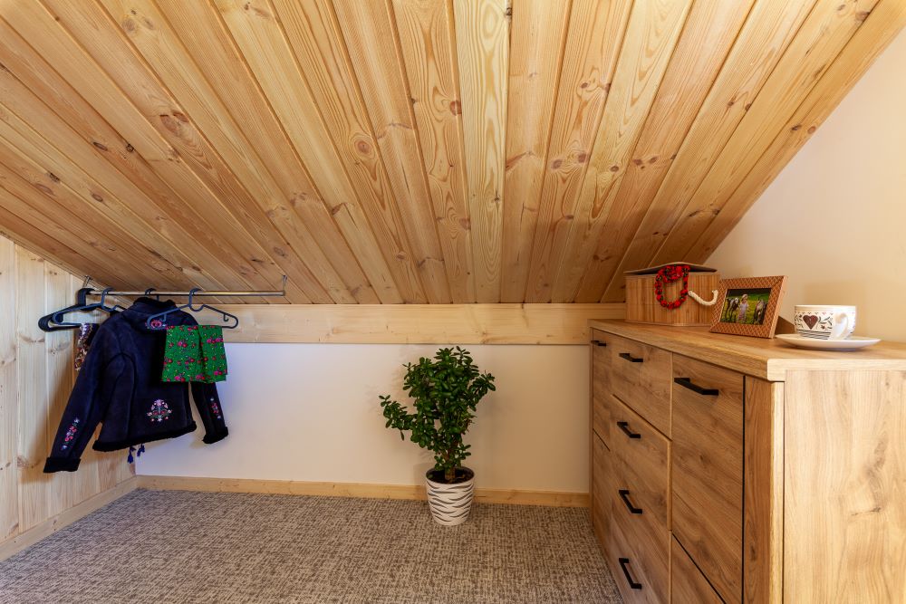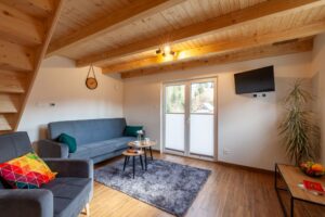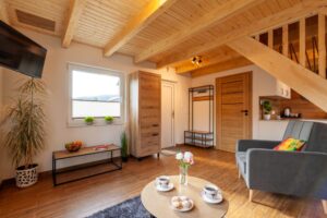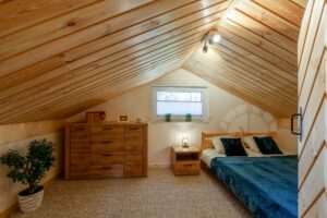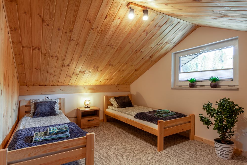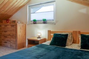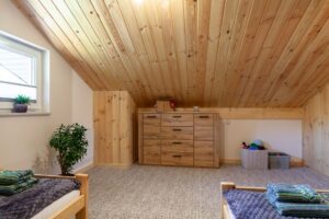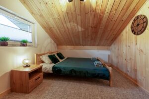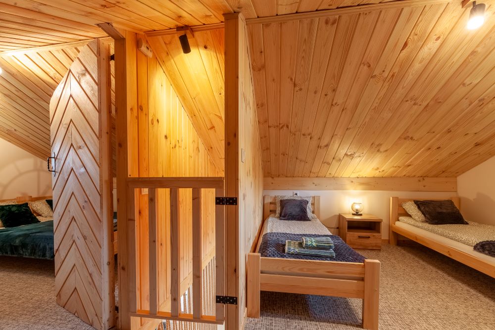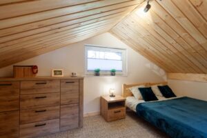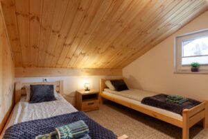 Na piętrze dwa pomieszczenia – zamykana sypialnia z podwójnym łóżkiem (możliwość rozłączenia na 2 pojedyncze) oraz otwarta sypialnia z dwoma łózkami pojedynczymi . Schody zabezpieczone bramką co idealnie sprawdza się w przypadku mniejszych dzieci.