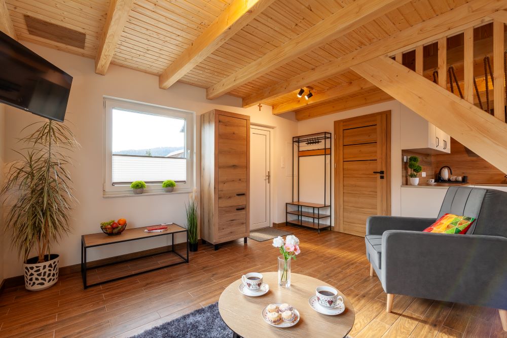 Na parterze znajduje się duży salon z rozkładaną sofą , w pełni wyposażona kuchnia, w której można przygotować posiłek i wygodna łazienka z prysznicem.