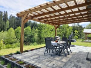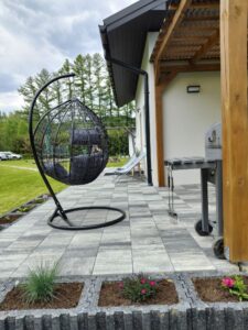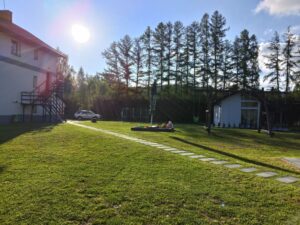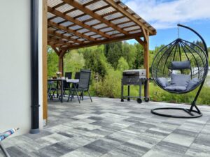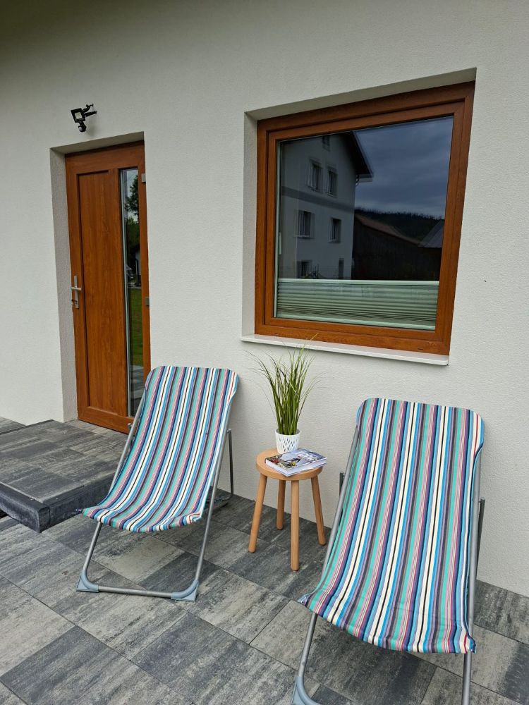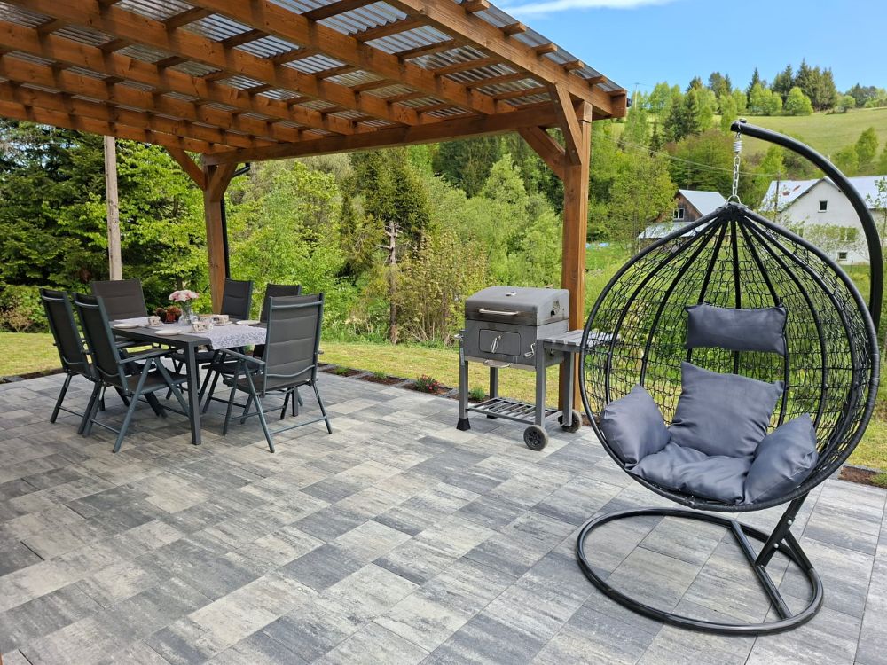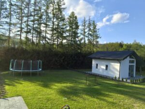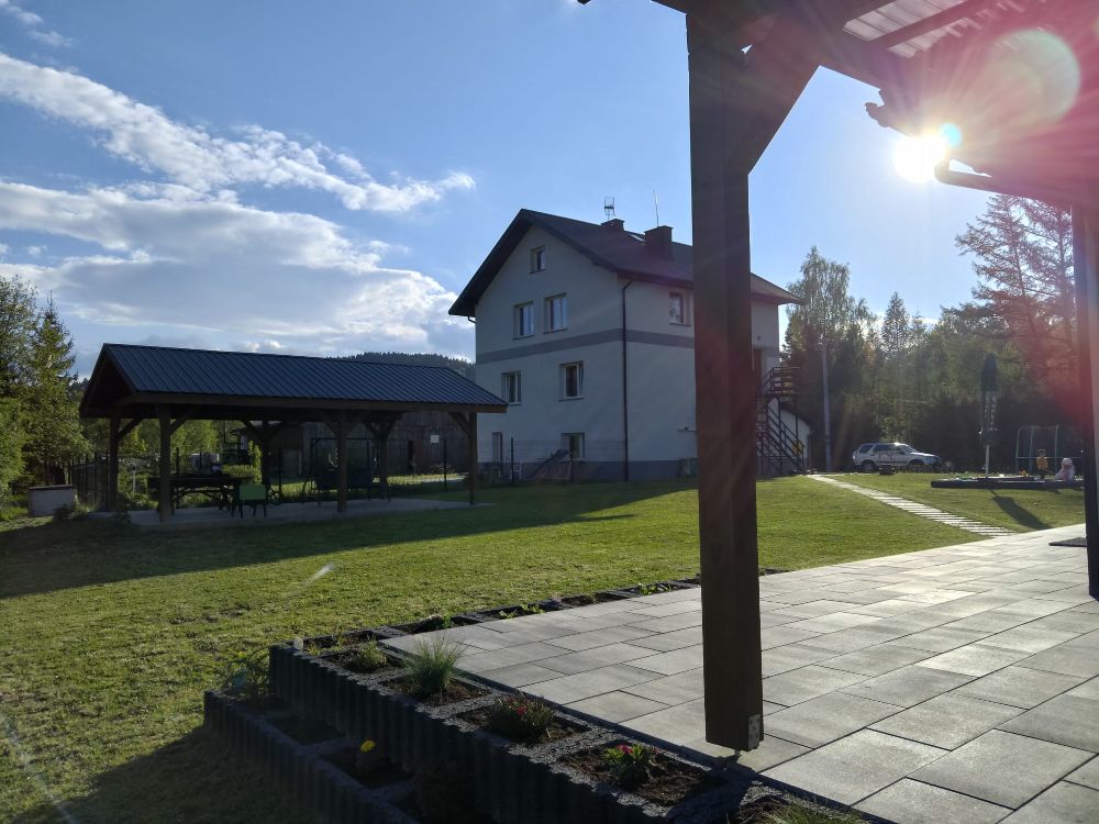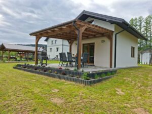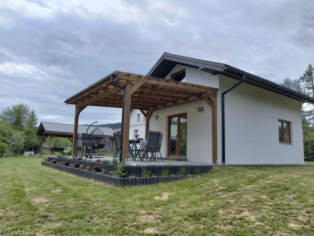 Domek należy do agroturystyki – wszystkie atrakcje typu plac zabaw, ogród i zagrody ze zwierzętami są wspólne z pozostałymi użytkownikami. Jednak przed domkiem znajduje się prywatny taras z meblami ogrodowymi oraz grill do wyłącznej dyspozycji.