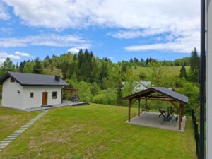 Domek położony na skraju działki, w pobliżu rzeki z widokiem na góry.